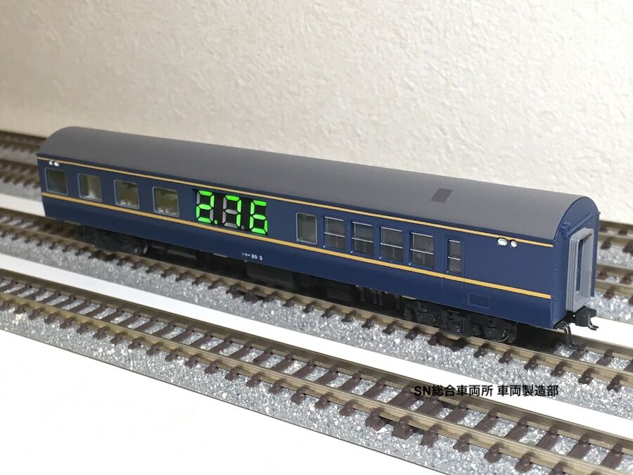 この製品はK社製20系客車をベースに製作した、Nゲージの線路に流れる電気の電圧を測定する機能を持つ車両です。車載の電圧計により線路にどのくらいの電圧がかかっているか、車両を走らせながらリアルタイムで見ることが出来ます。固定式レイアウトでの電圧降下場所やポイントレール・ジョイナーの不良箇所の把握に役立ちます。動力を搭載していませんので他のNゲージ動力車に連結させて走らせて下さい。