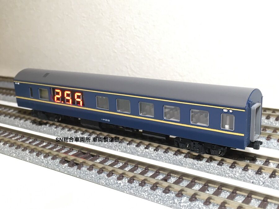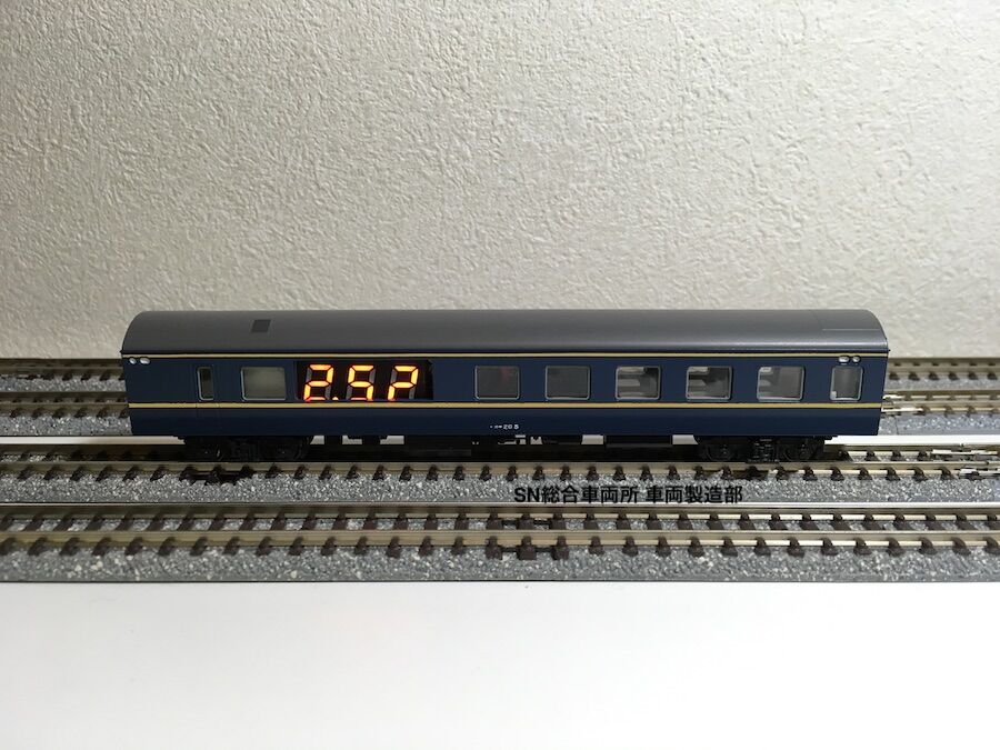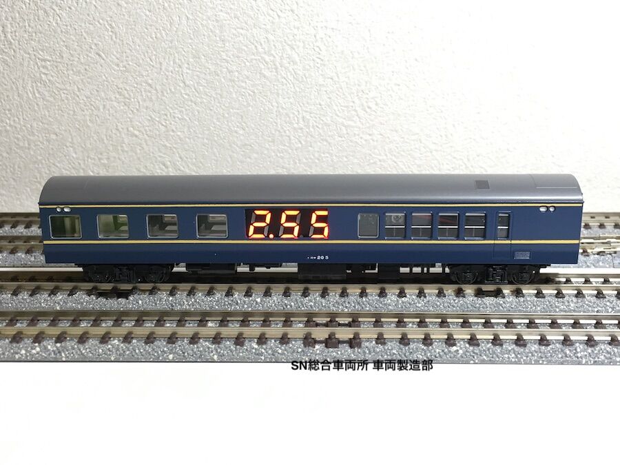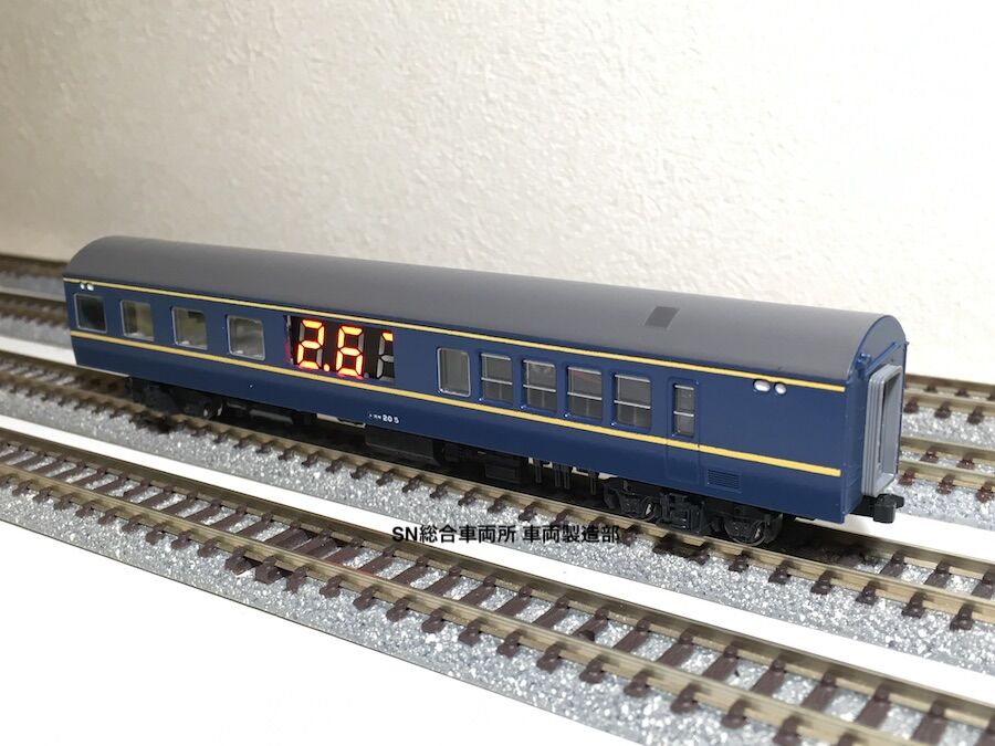 この製品はK社製20系客車をベースに製作した、Nゲージの線路に流れる電気の電圧を測定する機能を持つ車両です。車載の電圧計により線路にどのくらいの電圧がかかっているか、車両を走らせながらリアルタイムで見ることが出来ます。固定式レイアウトでの電圧降下場所やポイントレール・ジョイナーの不良箇所の把握に役立ちます。動力を搭載していませんので他のNゲージ動力車に連結させて走らせて下さい。