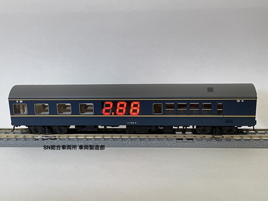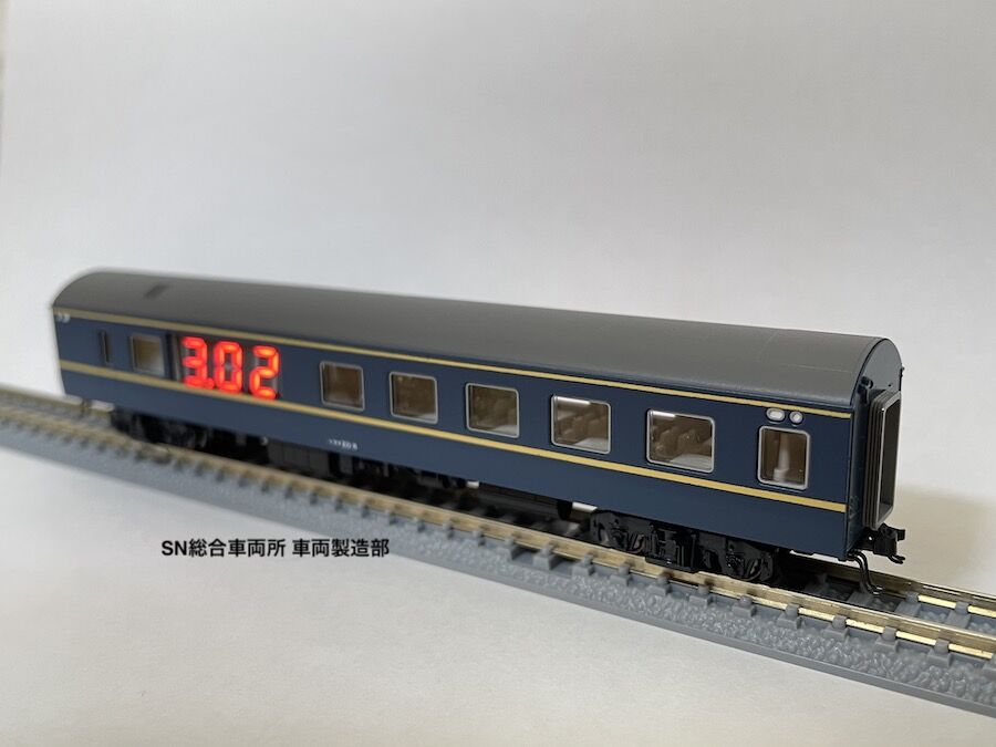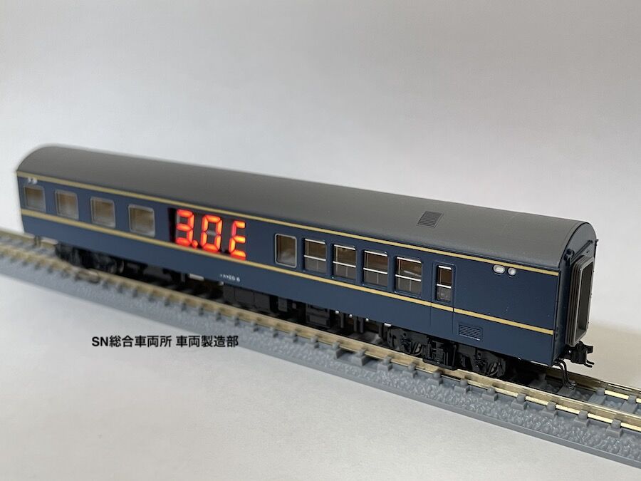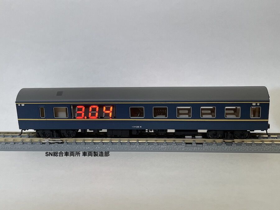 この製品はK社製20系客車をベースに製作した、Nゲージの線路に流れる電気の電圧を測定する機能を持つ車両です。車載の電圧計により線路にどのぐらいの電圧がかかっているか、車両を走らせながらリアルタイムで見ることが出来ます。固定式レイアウトでの電圧降下場所やポイントレール・ジョイナーの不良箇所の把握に役立ちます。動力を搭載していませんので他のNゲージ動力車に連結させて走らせて下さい。