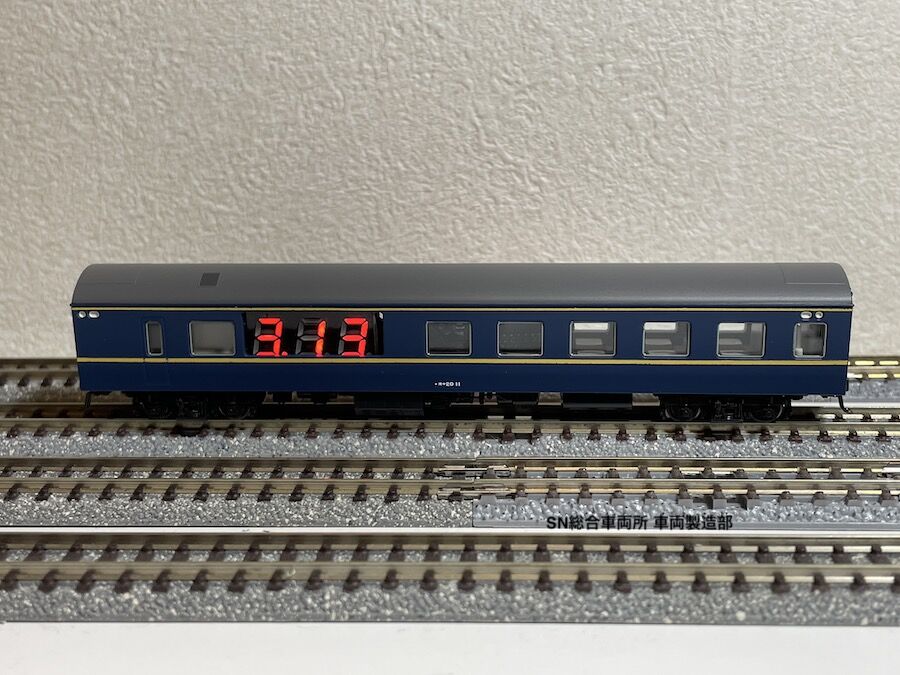 この製品はK社製20系客車をベースに製作した、Nゲージの線路に流れる電気の電圧を測定する機能を持つ車両です。車載の電圧計により線路にどのぐらいの電圧がかかっているか、車両を走らせながらリアルタイムで見ることが出来ます。固定式レイアウトでの電圧降下場所やポイントレール・ジョイナーの不良箇所の把握に役立ちます。動力を搭載していませんので他のNゲージ動力車に連結させて走らせて下さい。
