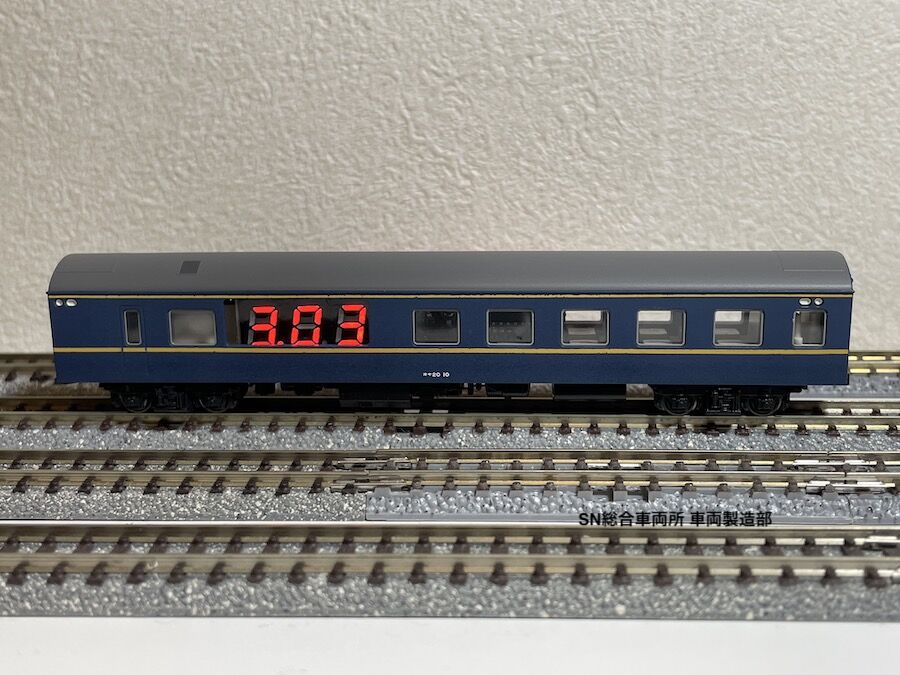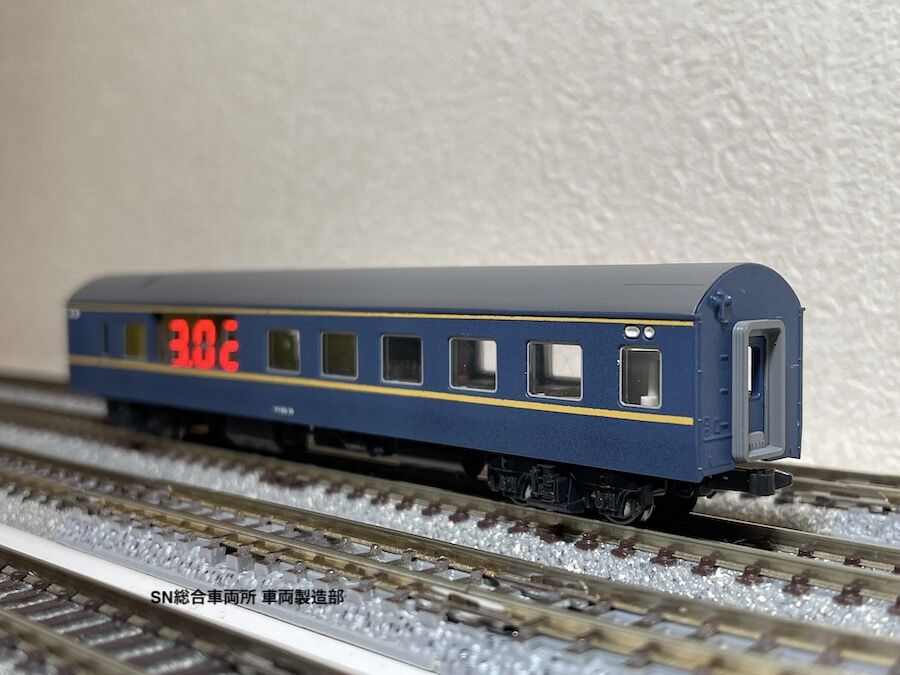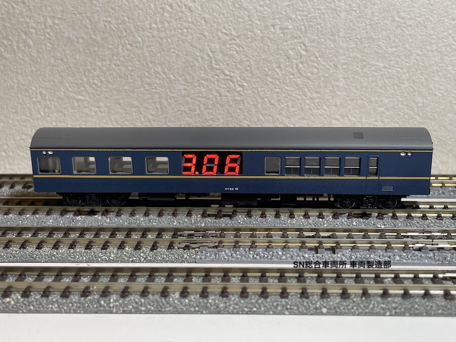 この製品はK社製20系客車をベースに製作した、Nゲージの線路に流れる電気の電圧を測定する機能を持つ車両です。車載の電圧計により線路にどのぐらいの電圧がかかっているか、車両を走らせながらリアルタイムで見ることが出来ます。固定式レイアウトでの電圧降下場所やポイントレール・ジョイナーの不良箇所の把握に役立ちます。動力を搭載していませんので他のNゲージ動力車に連結させて走らせて下さい。